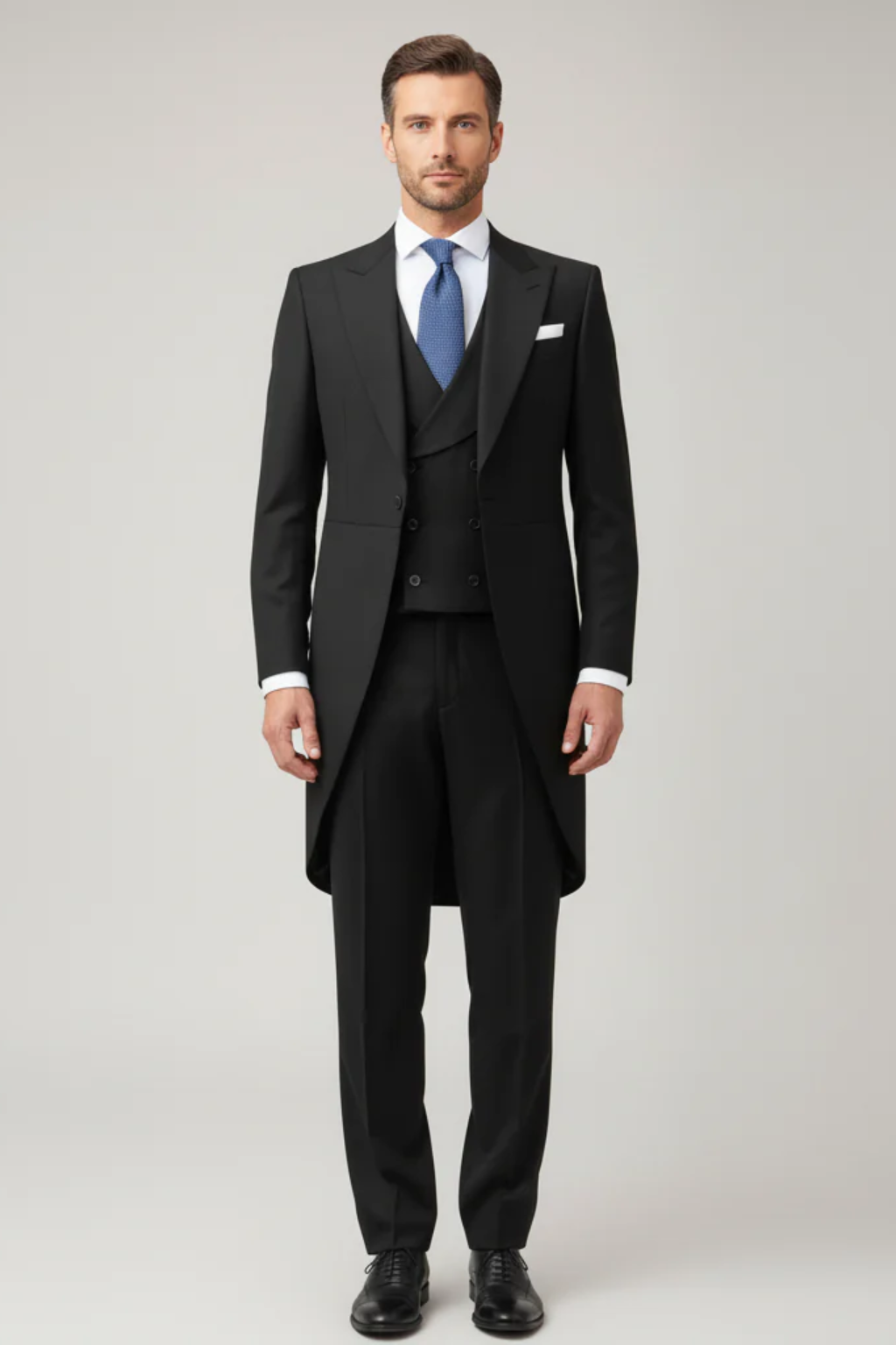 Design: Tailcoat-style three-piece suit with double-breasted waistcoat and formal trousers.