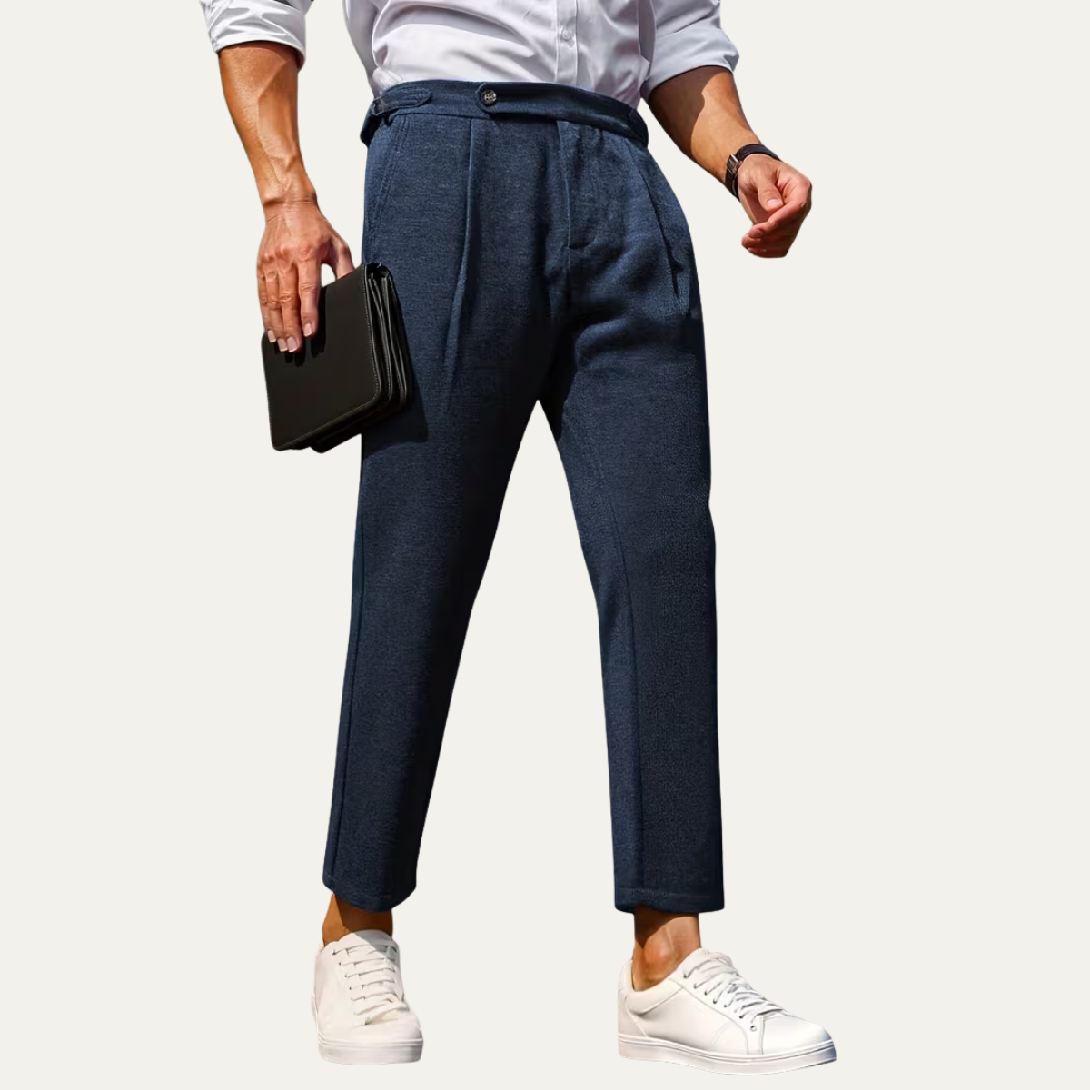 - Features: Smooth fabric finish, structured waistband, belt loop design, and secure button closure for a refined appearance.