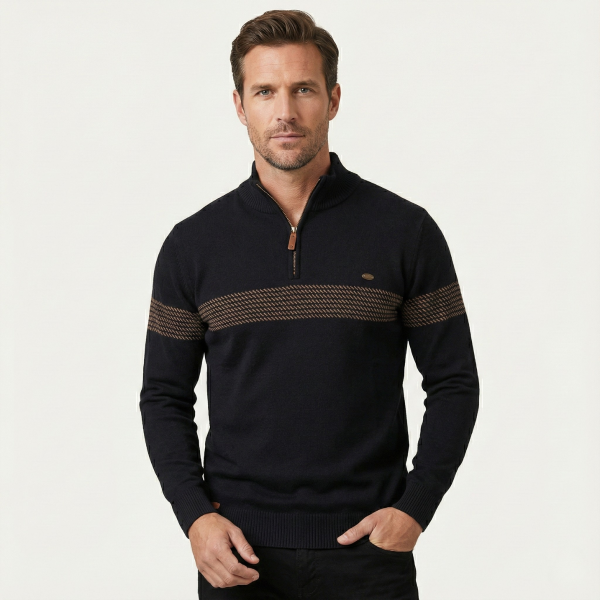 - Features: Stand collar with half zip closure, textured chest stripe detail, and ribbed cuffs for a polished finish.