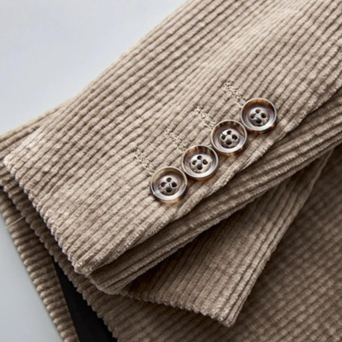 Features: Textured corduroy fabric, notched lapel, sleek button closure, practical pockets