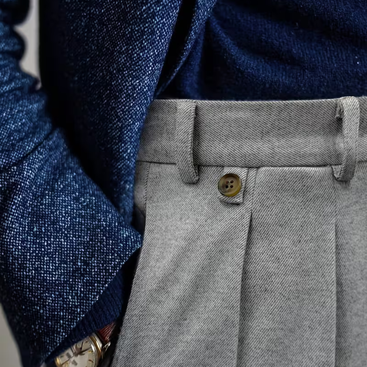 - Features: Classic front pleats, secure button closure, belt loops, practical pockets, and a refined straight leg profile.
